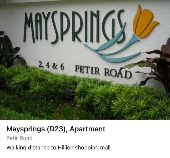 | 2024-11 | MAYSPRINGS | PETIR ROAD | 85 sqm (915 sqft) | $1,060,000 | $1159/sqft | 01-05 | Apartment | OCR | 23 | 99 yrs lease commencing from 1994 (68 yrs remaining) |
