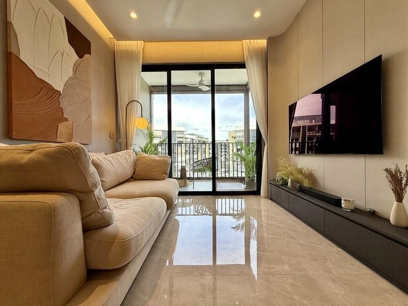 Step into a world of modern elegance as you enter this beautifully designed 3-bedroom unit at Sengkang Grand Residences. The abundant natural light floods the open-concept living space, highlighting the exquisite marble-look porcelain tiles and cove lighting that create a warm, inviting ambiance. Floor-to-ceiling sliding doors lead to a charming balcony, where you can enjoy outdoor seating with stunning city views, perfect for relaxation or entertaining.