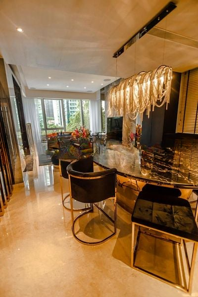 Step into a world of opulence as you enter this stunning 2-bedroom unit at Gramercy Park. Bathed in natural light, the space exudes luxury with its designer finishes, including a striking black marble dining table paired with a crystal chandelier, and floor-to-ceiling windows that frame lush greenery views. The ambiance is inviting and sophisticated, enhanced by gold accents and plush velvet furnishings that create a warm and welcoming atmosphere.