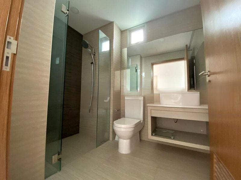 This well-maintained unit boasts standout features including a sleek open concept kitchen with modern cabinetry and a stylish black backsplash, a master bedroom with wood-look flooring and large windows, and a luxurious bathroom equipped with a rain shower and floating vanity. The efficient 59 sqm layout maximizes space, while the balcony with glass railing offers an unblocked view, perfect for relaxing with a morning coffee.
