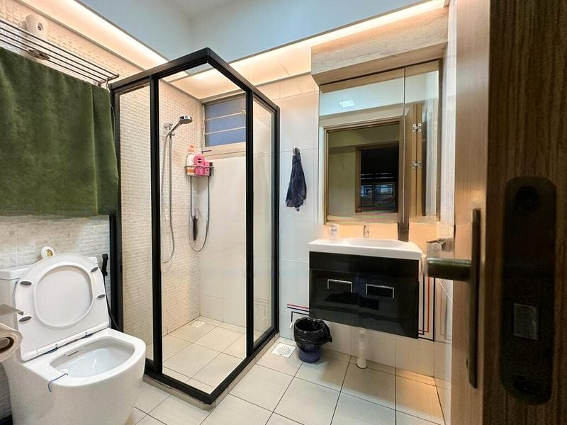 Step into this beautifully renovated HDB flat and be greeted by a modern industrial ambiance, highlighted by textured feature walls and a sophisticated track lighting system. The living room invites natural light through a viewing window, creating a warm and inviting atmosphere. The open concept dining area, complete with built-in bench seating, seamlessly connects to the galley kitchen, making it perfect for entertaining.