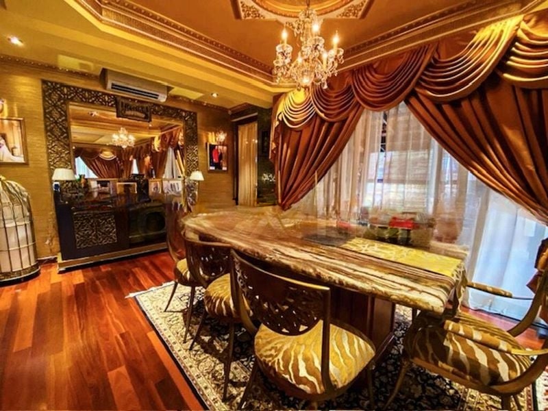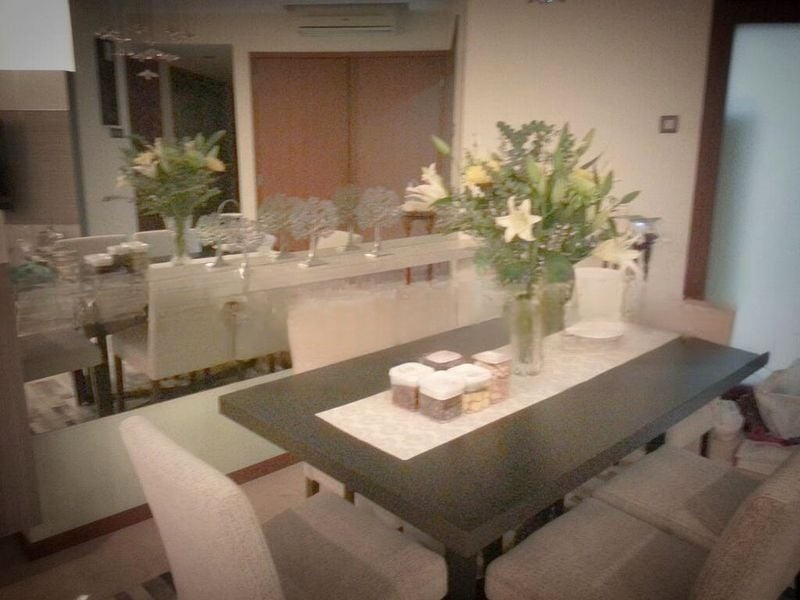 Step into a warm and inviting atmosphere as you enter this beautifully renovated unit at Edelweiss Park Condominium. The cozy living room, adorned with an L-shaped sofa and patterned armchair, is bathed in natural light from the large window, complemented by full-length curtains that enhance the sense of space. The dining area features a striking wall-to-wall mirror and decorative pendant lighting, creating an elegant setting for gatherings.