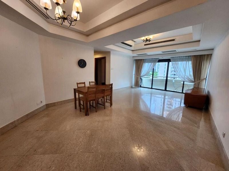 Step into a world of classic elegance as you enter this well-maintained 2-bedroom unit at Valley Park. The moderate natural light dances across the polished parquet flooring, highlighting the unique curved wall detail and creating an inviting ambiance. The marble-clad bathrooms, featuring a luxurious bathtub and a walk-in shower, elevate the space, making it a perfect retreat.