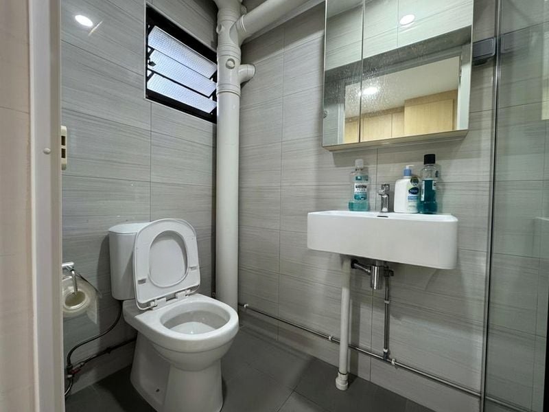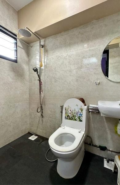 This thoughtfully designed 3-bedroom flat boasts a galley kitchen adorned with glossy purple cabinetry and glitter finishes, perfect for culinary enthusiasts. The master bedroom features a ceiling fan and a large window, while the study/bedroom offers built-in wooden bookshelves for your literary collection. The bathrooms are a highlight, showcasing a luxurious rain shower and elegant floor-to-ceiling tiles.