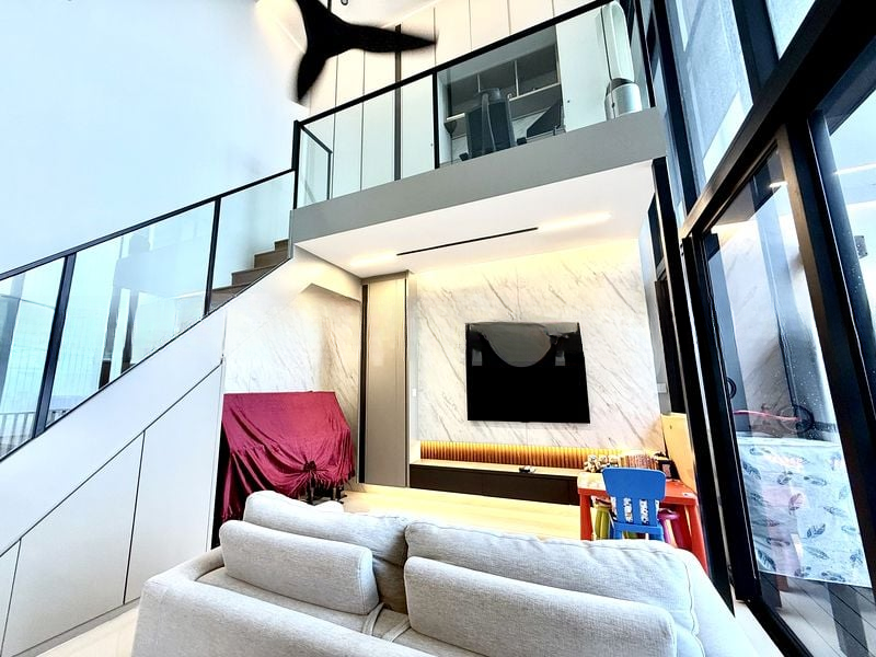 Step into a world of elegance and comfort as you enter this beautifully renovated 3-bedroom unit at The Trilinq. Bathed in natural light, the open-concept living space features floor-to-ceiling windows that frame stunning city skyline views. The bright ambiance is enhanced by a striking yellow accent staircase and a chic red subway tile backsplash in the kitchen, creating a vibrant yet sophisticated atmosphere.