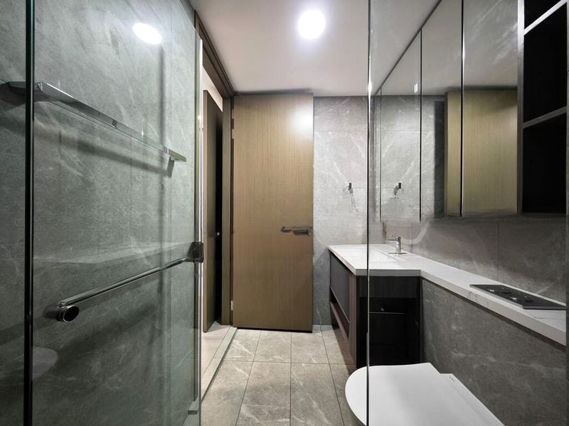 Step into a world of contemporary elegance as you enter this brand-new 2-bedroom unit at ONE-NORTH EDEN. The modern minimalist design is accentuated by an abundance of natural light filtering through dual-layer curtains, highlighting the sleek finishes and spacious layout. The ambiance is inviting, with light wood-look laminate flooring and clean white walls that create a serene atmosphere.