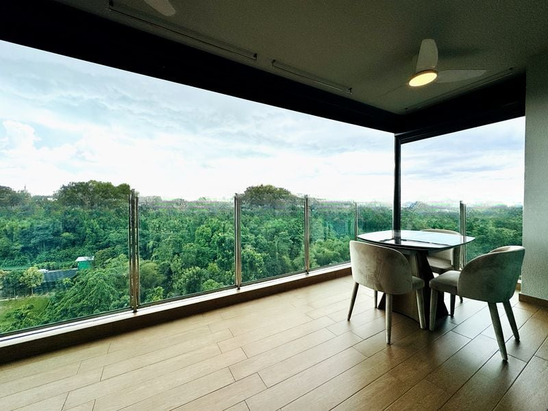 Step into a bright and airy sanctuary at Normanton Park, where abundant natural light floods through floor-to-ceiling windows, offering stunning views of the city skyline and lush greenery. The polished tile flooring and open-concept living and dining area create an inviting ambiance, perfect for relaxation or entertaining guests on your private balcony.