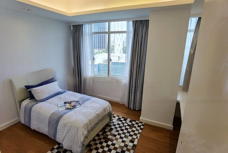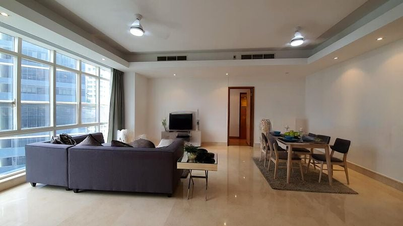 The open-concept layout seamlessly integrates the living and dining areas, featuring a 6-seater dining set and dual ceiling fans for added comfort. The kitchen is a chef's dream with light wood cabinetry, black granite countertops, and high-end stainless steel appliances. Retreat to the master bedroom, where warm wood flooring and built-in wardrobes complement the stunning views. The luxurious bathroom boasts a corner jacuzzi bathtub and a glass-enclosed walk-in shower, perfect for unwinding after a long day.