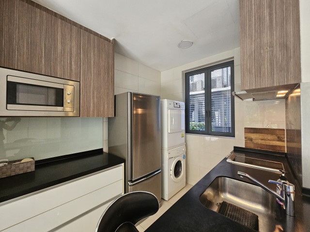 This unit features an open-plan living area that seamlessly connects to the balcony, perfect for entertaining or relaxing. The kitchen boasts wood-look upper cabinets and sleek black countertops, equipped with integrated appliances for your convenience. The bedroom offers a tranquil retreat with a built-in sliding wardrobe and a large window framing picturesque views. The bathroom is elegantly designed with a glass shower partition and mirrored vanity cabinet, ensuring both style and functionality.
