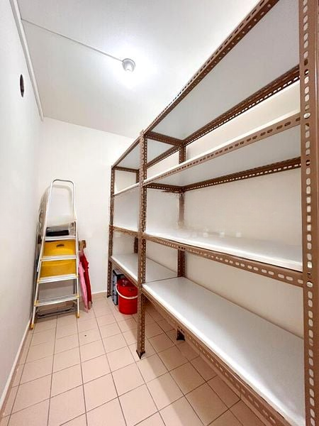 This thoughtfully designed 3-bedroom flat features a master bedroom with a full-height built-in wardrobe and a ceiling fan, ensuring comfort and convenience. The common bedroom is equipped with a built-in study desk, making it ideal for work or study. The kitchen boasts dark wood cabinetry and a tiled backsplash, complemented by a utility area with a washing machine. Safety is prioritized with grab bars in the bathrooms, while the living and dining areas are perfect for entertaining.
