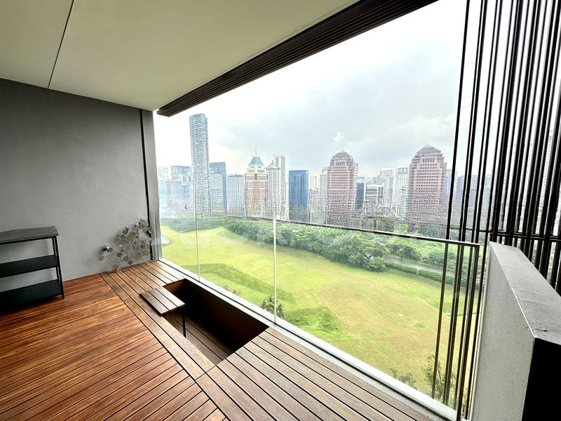 Step into a world of modern minimalism where abundant natural light floods through floor-to-ceiling windows, offering breathtaking views of the city skyline and lush greenery. The open-concept layout seamlessly blends the living and bedroom areas, enhanced by light wood flooring and a textured feature wall that adds a touch of sophistication. The wooden balcony decking invites you to unwind while enjoying the serene park view.
