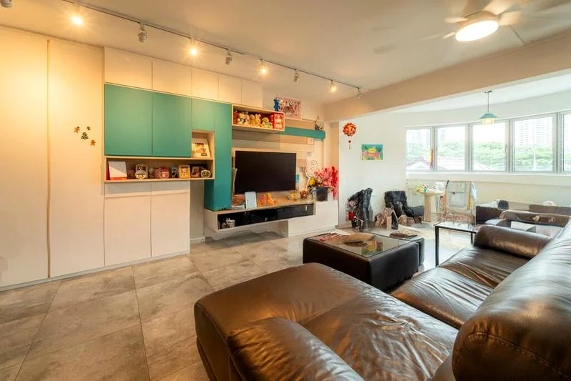 This well-maintained 3-bedroom unit features standout elements such as a teal glass backsplash in the kitchen, patterned floor tiles, and a breakfast bar that seamlessly integrates with the living area. The master bedroom boasts a floor-to-ceiling built-in wardrobe and a dedicated study area, while the bathroom showcases modern finishes with exposed piping and a stylish pedestal sink.