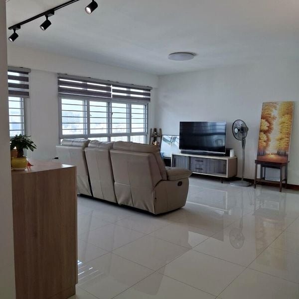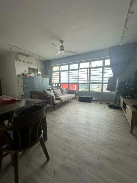 Step into this bright and airy HDB flat, where abundant natural light floods the spacious living and dining area, accentuated by large windows that frame stunning views of the lush greenery and cityscape. The open concept layout, complemented by large format polished floor tiles, creates an inviting ambiance perfect for relaxation or entertaining.