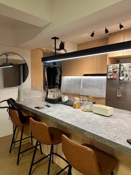 This well-maintained unit boasts a large kitchen island with a breakfast bar, ideal for casual dining. The master bedroom, adorned with a blue accent wall, leads to a stylish dressing area with built-in wardrobes and a full-length mirror. Each room is thoughtfully designed, from the minimalist study with large windows to the luxurious bathroom featuring a walk-in glass shower and a sleek black vessel sink.