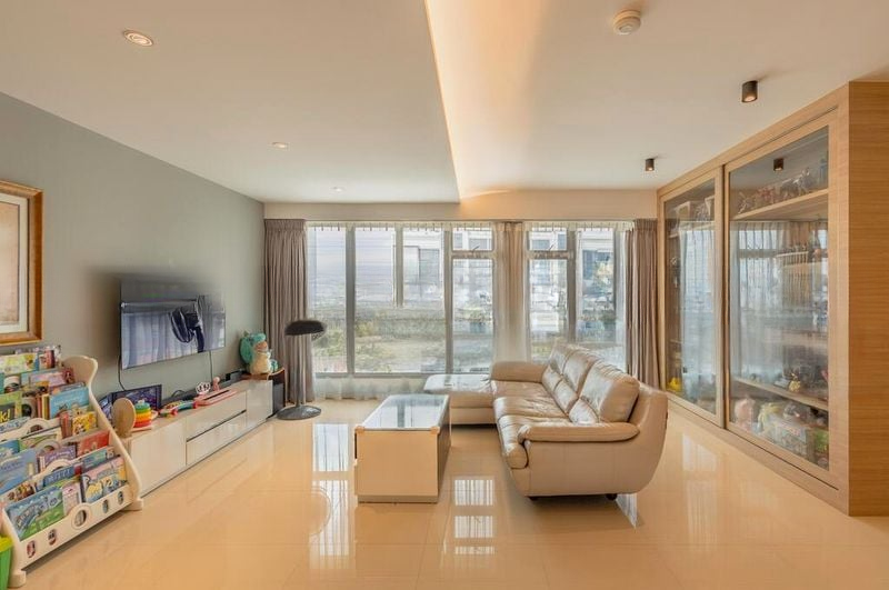 Step into a beautifully renovated sanctuary where abundant natural light floods the space, highlighting the modern finishes and cozy atmosphere. The open-concept living area features a stunning wood-paneled TV wall, a built-in window seat, and a large display cabinet, creating an inviting environment perfect for relaxation and entertainment.
