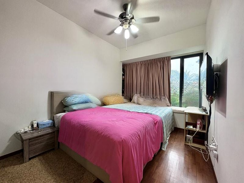 This well-maintained 3-bedroom condo features a thoughtful layout with standout elements such as a galley kitchen boasting two-tone cabinetry and sleek black countertops, perfect for culinary enthusiasts. The master bedroom offers a tranquil retreat with its wall-mounted TV and expansive windows, while the second bedroom is equipped with a platform bed that includes built-in drawers and an integrated study desk. Modern finishes in the bathrooms, including a glass shower partition and contemporary vanity, elevate the living experience.