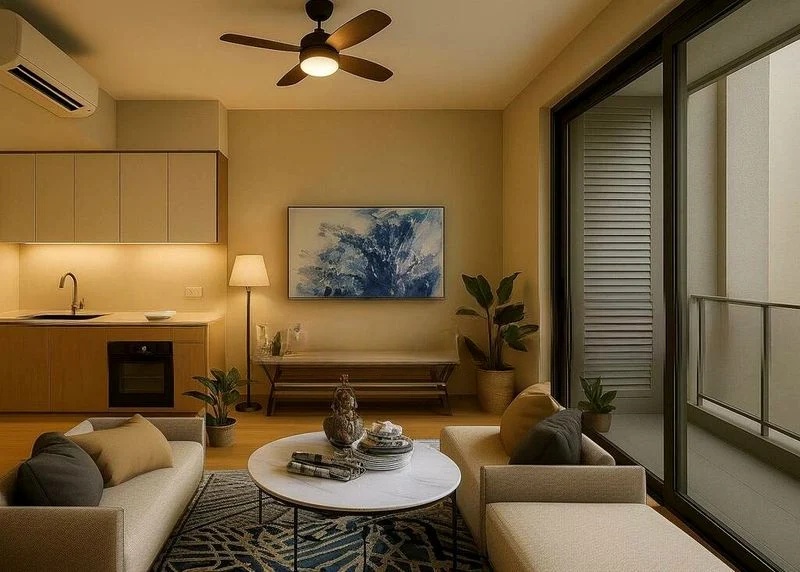 Step into a haven of modern elegance at Meyer Mansion, where the warm ambiance envelops you as you enter this beautifully designed 1-bedroom unit. The open-concept living area, bathed in natural light, showcases an inviting L-shaped sofa and sliding glass doors that lead to a private balcony with unobstructed views of the pool and lush greenery, creating a serene retreat right at home.
