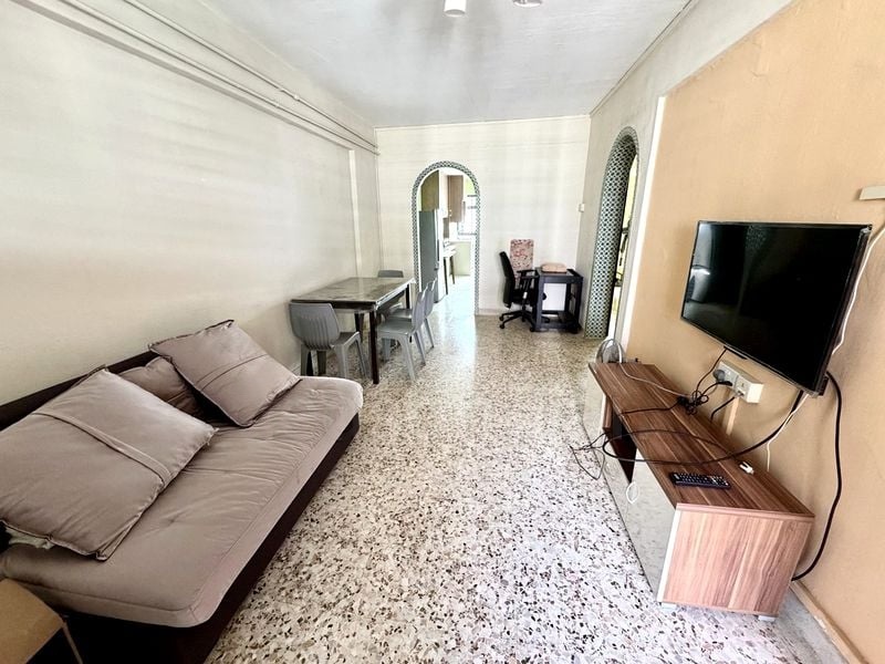 Step into a bright and airy sanctuary at 43 Chai Chee St, where abundant natural light dances across the spacious living area. The striking yellow and white striped feature wall instantly draws your eye, creating a cheerful ambiance that welcomes you home. Enjoy views of neighboring greenery and HDB blocks, enhancing the sense of space and tranquility.