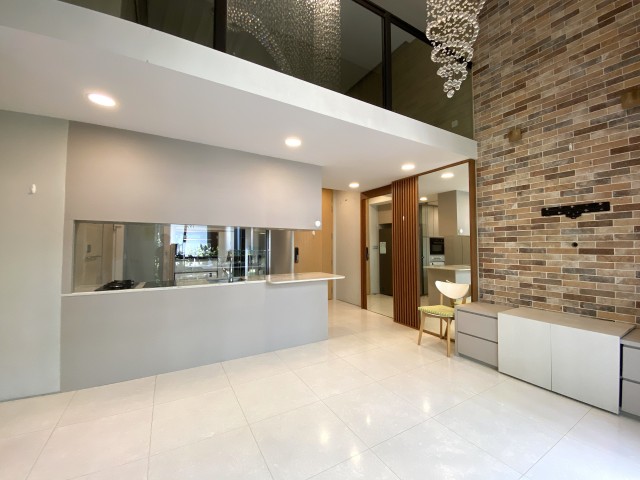 Step into a world of modern luxury as you enter this stunning unit at The Creek @ Bukit. Bathed in abundant natural light, the double volume living room features high ceilings and floor-to-ceiling windows that offer captivating views of the pool and lush greenery. The designer finishes, including a striking vertical slat feature wall, create an inviting ambiance that feels both sophisticated and warm.
