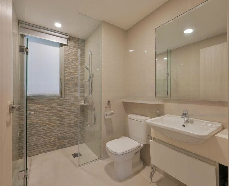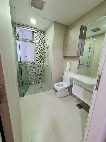 This well-maintained unit boasts an efficient layout, featuring a spacious master bedroom with an en-suite bathroom and built-in wardrobe, along with two additional bedrooms currently designed as a study and nursery. Each room is equipped with ceiling fans and track lighting, while the modern bathroom showcases a glass shower enclosure and textured wall tiles. The generous balcony extends your living space outdoors, perfect for relaxing or entertaining.