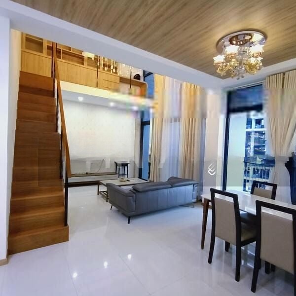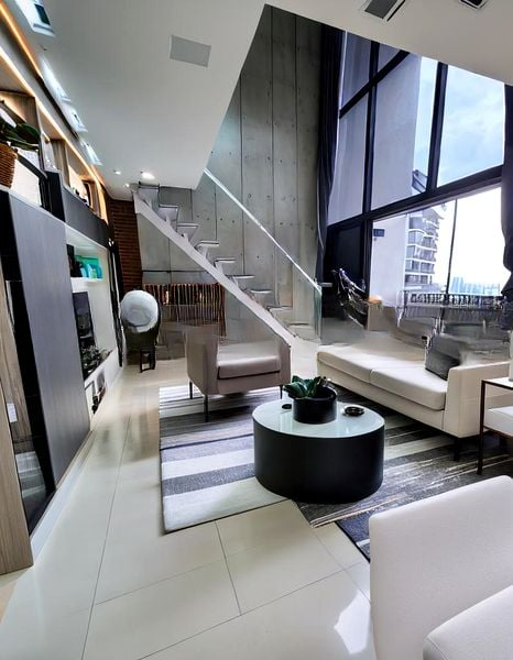 Step into a world of modern elegance as you enter this stunning unit at The Trilinq. Bathed in abundant natural light, the double-volume living room features a custom wooden feature wall and designer furniture that creates a warm yet sophisticated ambiance. The polished tile flooring and designer pendant lighting add to the luxurious feel, while the large floor-to-ceiling windows offer captivating urban views that invite the vibrant city into your home.