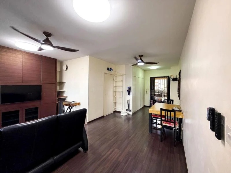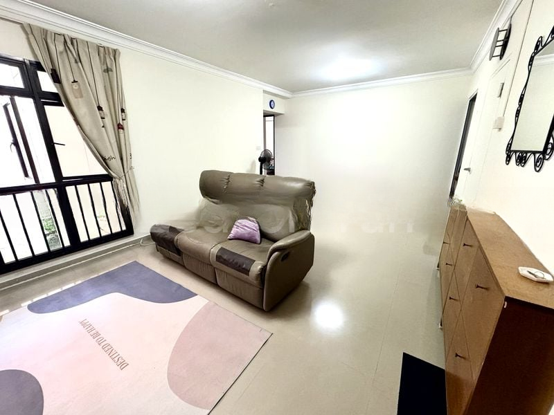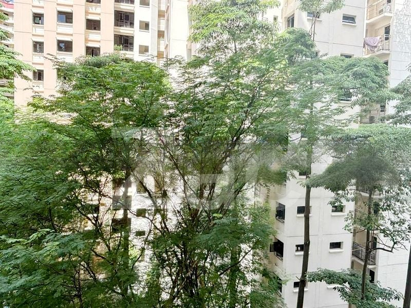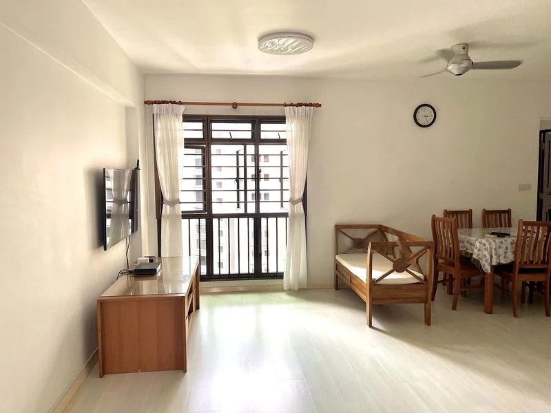 Step into this inviting 4-room point block end unit, where light blue walls and white tiled flooring create a serene ambiance. The living room, enhanced by recessed lighting and sliding glass doors, opens up to lush tree-top views, inviting nature into your home. The moderate natural light filters through, giving the space a warm and welcoming feel, perfect for relaxation or entertaining.