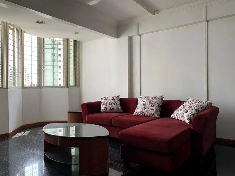 This well-maintained unit features an efficient 3-bedroom plus study layout, perfect for families or professionals seeking extra space. The living room boasts a red L-shaped sofa and an oval coffee table, while the dining area is adorned with a glass top table, both set against the backdrop of expansive city views. The kitchen, with its L-shaped layout and vibrant blue and yellow cabinetry, is both functional and stylish, complemented by a service balcony for added convenience.