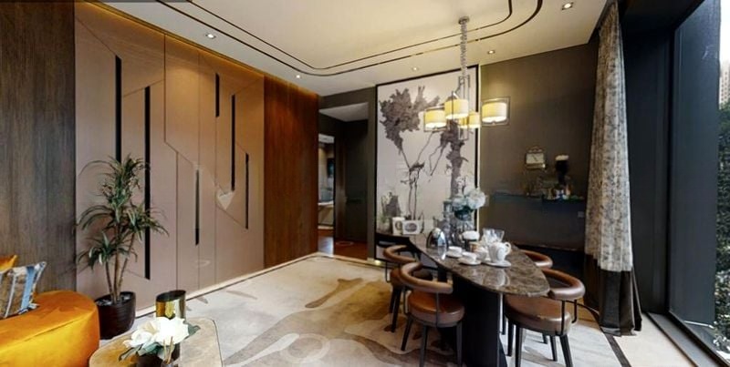 Step into a world of modern luxury at 3 Orchard By-The-Park, where abundant natural light floods through floor-to-ceiling glass windows, illuminating the elegant finishes throughout. The double-volume high ceiling creates an airy ambiance, while the organic-shaped designer mirror adds a unique touch to the space. Enjoy serene views of lush greenery and the vibrant street below from your spacious balcony, complete with wooden decking and outdoor lounge furniture.
