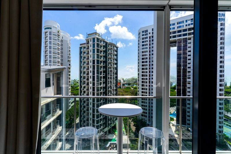 Step into a world of light and tranquility in this beautifully maintained 2-bedroom unit at NYON. The abundant natural light floods the space, accentuating the polished wood flooring and the soothing light blue walls. With large windows framing stunning views of the urban landscape, pool, and lush greenery, you will feel a sense of peace and relaxation as you enter.