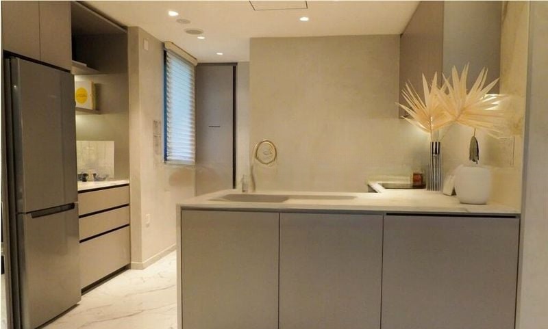 This efficient layout features a master bedroom with an en-suite bathroom, a second bedroom, and a common bathroom, all adorned with high-quality finishes. The bathrooms boast marble-look wall tiles and a luxurious rain shower, while the living area flows seamlessly into a functional kitchen with an attached yard and utility room. The highlight of the development is the stunning lap pool and poolside greenery, perfect for relaxation and leisure.