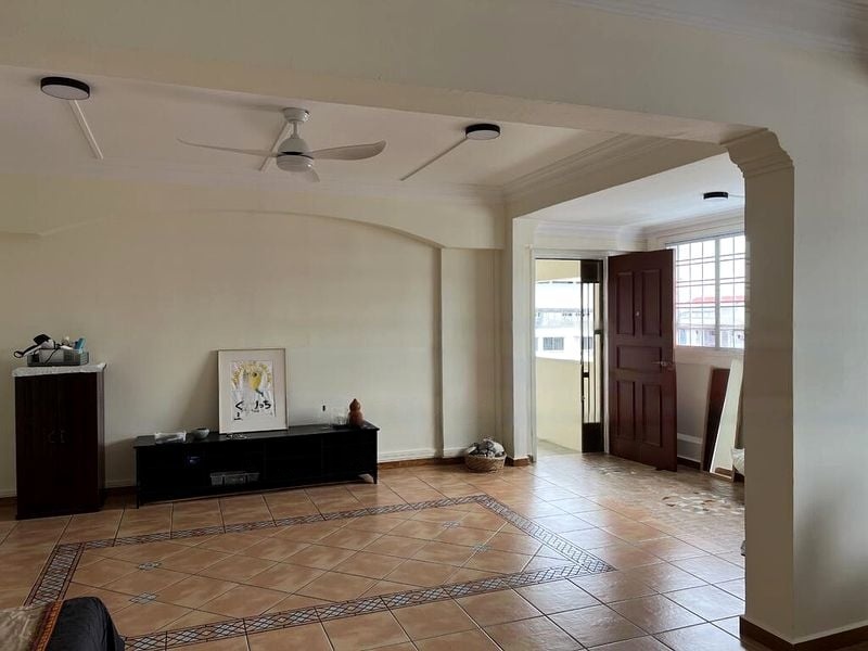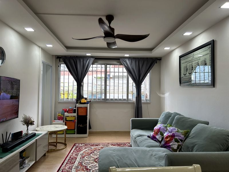 This well-maintained 5-room improved unit features three generous bedrooms, including a master bedroom with large windows and air conditioning for comfort. The renovated bathroom boasts modern wall tiles and a convenient bifold door, while the living area is enhanced by a ceiling fan and built-in shelving partition, adding both style and functionality to the space. The efficient layout ensures a clear separation between living and sleeping quarters, making it ideal for families.