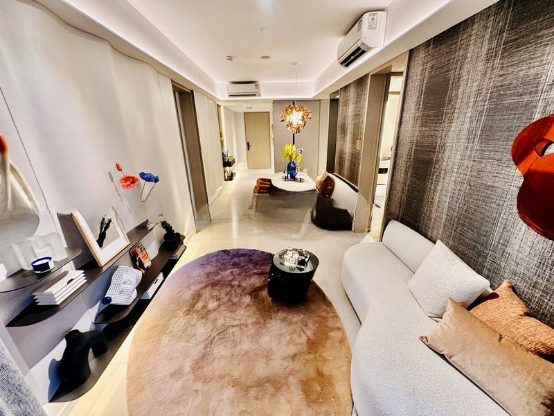 Step into a world of modern luxury as you enter this brand-new designer unit at NAVA GROVE. Bathed in abundant natural light, the floor-to-ceiling windows offer breathtaking views of the lush greenery and city skyline. The ambiance is elevated by designer pendant lighting and Japanese-inspired wooden screens, creating a serene yet sophisticated atmosphere.