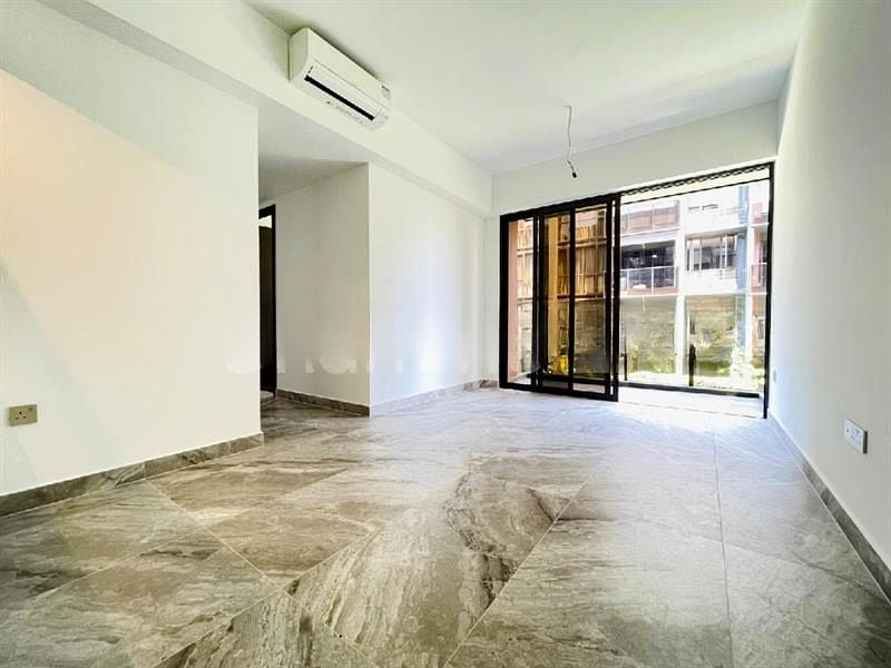 This thoughtfully designed unit features dark wood flooring in the bedrooms, complemented by built-in sliding wardrobes for optimal space utilization. The modern bathroom boasts a floating vanity with under-cabinet LED lighting, enhancing the contemporary feel. With a spacious layout of 624 sqft, the communal areas include a designer lobby with a marble-look reception desk and an outdoor dining area perfect for gatherings.