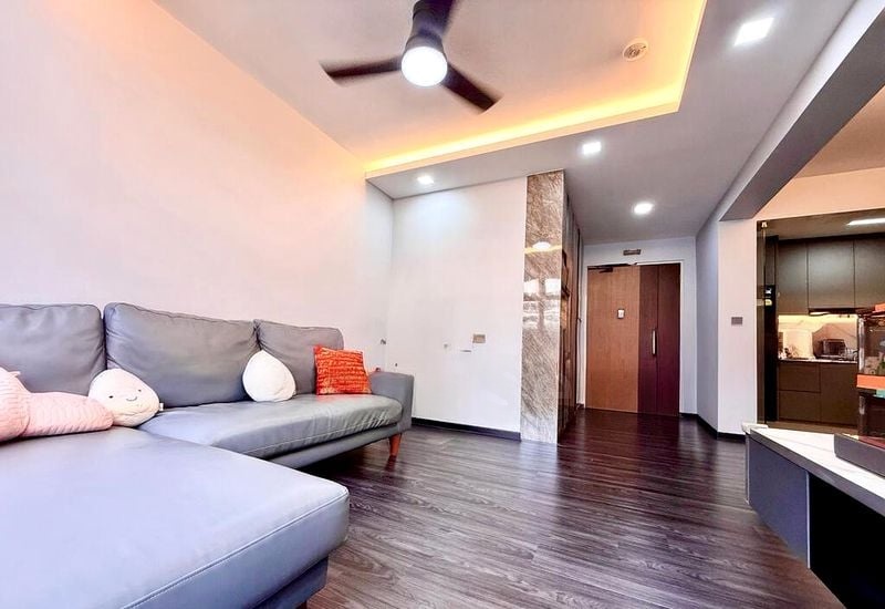 Step into this inviting 4-room HDB flat and be greeted by a warm ambiance filled with natural light filtering through large windows. The functional layout showcases a dedicated study nook and a spacious living area adorned with an ornate area rug, creating a perfect blend of comfort and style. The glass partition study/pet room offers versatility, while the blue kitchen cabinetry adds a modern touch to the heart of the home.