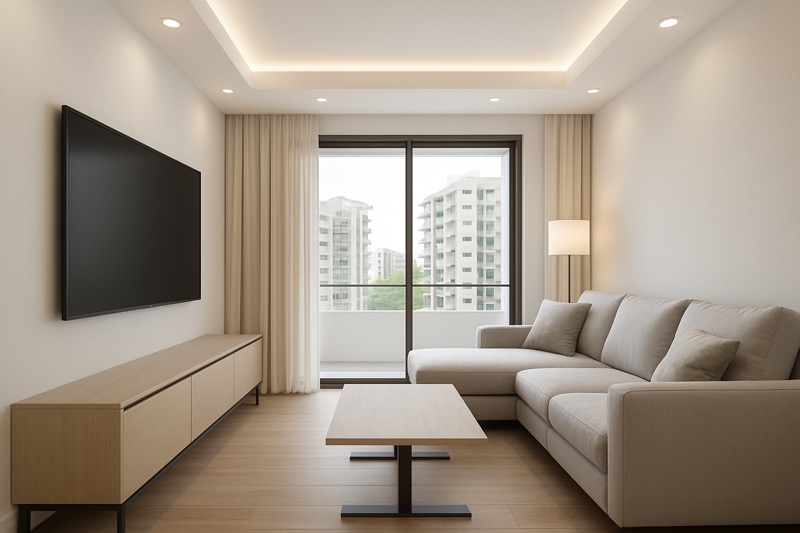 Step into a bright and airy sanctuary at Punggol Walk, where abundant natural light floods the space, highlighting the elegant wood flooring and modern finishes. The living room invites relaxation with its recessed ceiling lighting and a striking red and white striped feature wall, complemented by a cozy black leather sofa. The balcony offers a serene garden space with unblocked views of lush greenery and the city skyline, creating a perfect retreat.