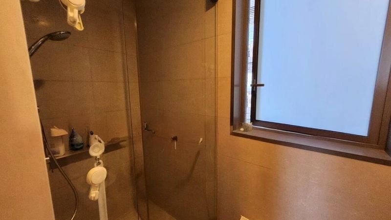 Step into a sanctuary of modern minimalism where abundant natural light floods through floor-to-ceiling windows, illuminating the elegant living space. The white brick-style feature wall and stone-look tile flooring create a chic ambiance, while the views of the lush greenery and city skyline invite you to unwind in style.