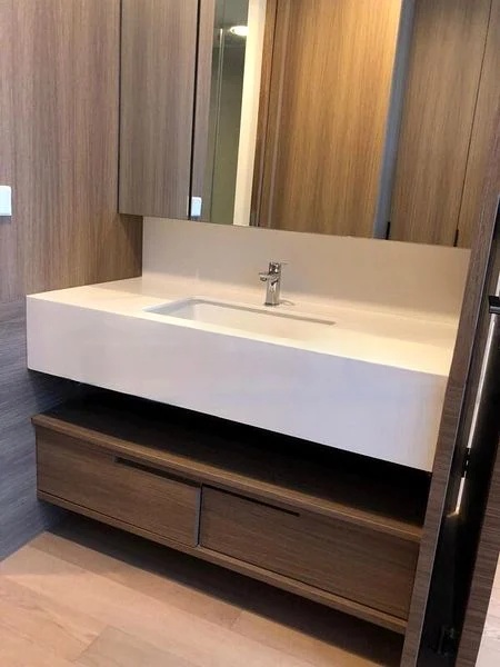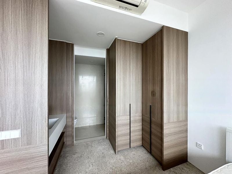 This efficient 2-bedroom, 2-bathroom unit boasts an open-plan layout, perfect for contemporary living. The kitchen is equipped with integrated appliances and wood-grain cabinetry, seamlessly connecting to the living area. Enjoy the luxury of a rain shower in the master ensuite, complemented by high-quality finishes like a floating vanity and wall-hung toilet, ensuring both comfort and sophistication.