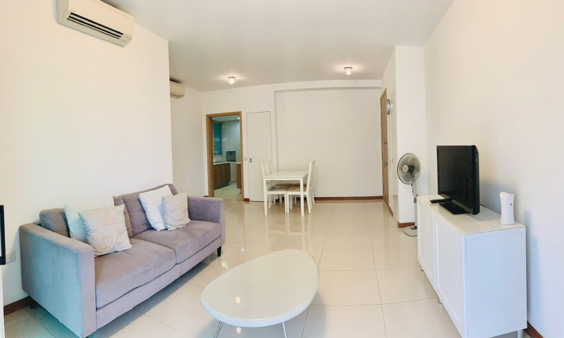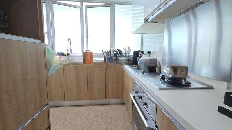 Step into a bright and airy sanctuary where abundant natural light floods through large floor-to-ceiling windows, showcasing stunning urban skyline views. The polished floor tiles and modern finishes create an inviting ambiance, making you feel right at home from the moment you enter.