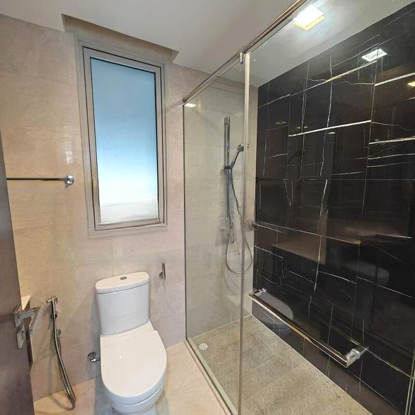 Step into a beautifully designed sanctuary where modern minimalist aesthetics meet abundant natural light. The sleek finishes, highlighted by a striking black glass partition and elegant pendant lighting, create an inviting ambiance. Enjoy the urban views from your balcony, complete with wooden decking, perfect for relaxation or entertaining.