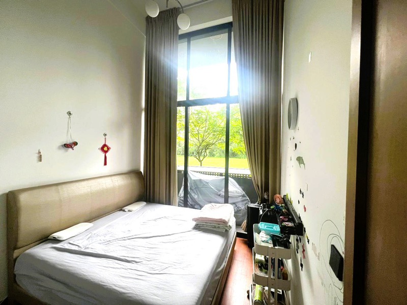 Step into a sanctuary of light and space at KANDIS RESIDENCE, where high ceilings and floor-to-ceiling windows create an inviting atmosphere. The bright and airy living room, adorned with pristine white tiled flooring, seamlessly connects to a balcony that offers serene views of lush greenery and the sparkling swimming pool, perfect for relaxation and entertaining.