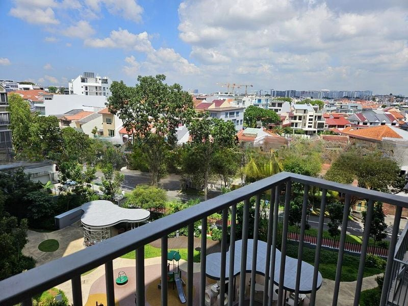 Step into a sanctuary of modern elegance, where abundant natural light floods through floor-to-ceiling windows, illuminating the high-gloss floor tiles and creating a warm, inviting ambiance. The spacious living area seamlessly connects to a private balcony, offering unblocked views of lush greenery and a nearby playground, perfect for relaxation or entertaining.