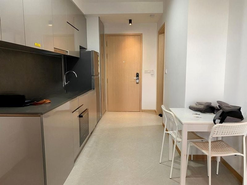 This efficient 1-bedroom unit boasts a seamless layout, with a compact dining area perfect for intimate meals. The bathroom is a standout, showcasing a stunning monochrome mosaic feature wall, a rain shower, and modern black shelving. Every detail has been thoughtfully curated, from the digital door lock to the high ceiling potential that enhances the sense of space.