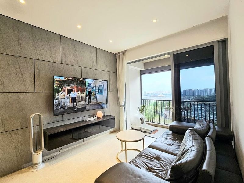 Step into a world of contemporary elegance as you enter this beautifully renovated 2-bedroom unit at Rivertrees Residences. Bathed in natural light, the living area features a striking stone-textured TV feature wall and a floating console that seamlessly blends style and functionality. The open concept dining area, accentuated by a full-height mirrored wall, invites you to enjoy meals with breathtaking views of the pool and river, while the balcony offers a perfect spot for relaxation with its unobstructed vistas.