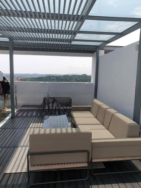 This spacious 5-bedroom unit boasts standout features including a stylish island kitchen with wooden cabinetry, a galley wet kitchen, and a built-in study desk perfect for remote work. The dining area, adorned with cane-back chairs and a long grey dining table, is designed for gatherings, while the luxurious bedrooms offer comfort with pool views and dark glass wardrobes. Every corner of this home reflects thoughtful design and quality craftsmanship.