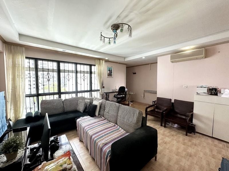Step into this beautifully renovated 3-bedroom HDB flat and be greeted by a harmonious blend of modern aesthetics and comfort. The living room features a striking black feature wall, complemented by recessed ceilings and cove lighting that create an inviting ambiance. Large windows frame views of lush greenery and the urban landscape, bathing the space in natural light.