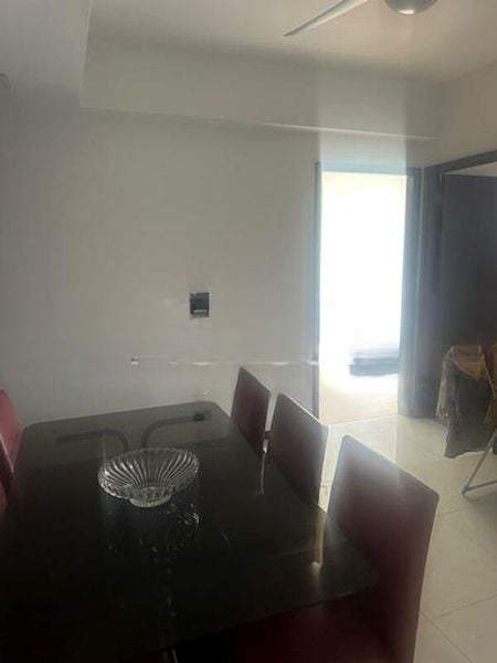 Step into a vibrant sanctuary where eclectic charm meets modern elegance. The moment you enter this well-maintained unit, you are greeted by a striking blue accent wall and a spacious open-concept living area bathed in natural light. The mirrored feature walls and modern circular pendant lighting create an inviting ambiance, while the large black kitchen island beckons culinary creativity, making it the heart of the home.