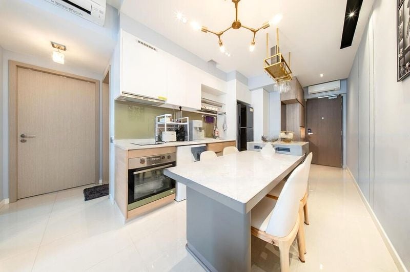 Step into a world of elegance and tranquility at TREASURE AT TAMPINES. This brand-new 2-bedroom unit greets you with an airy ambiance, accentuated by abundant natural light streaming through large windows. The polished tile flooring in the living room, complemented by designer organic-shaped ceiling lights, creates a sophisticated yet welcoming atmosphere. Enjoy seamless indoor-outdoor living with a balcony that invites you to unwind while taking in the lush greenery and urban vistas.