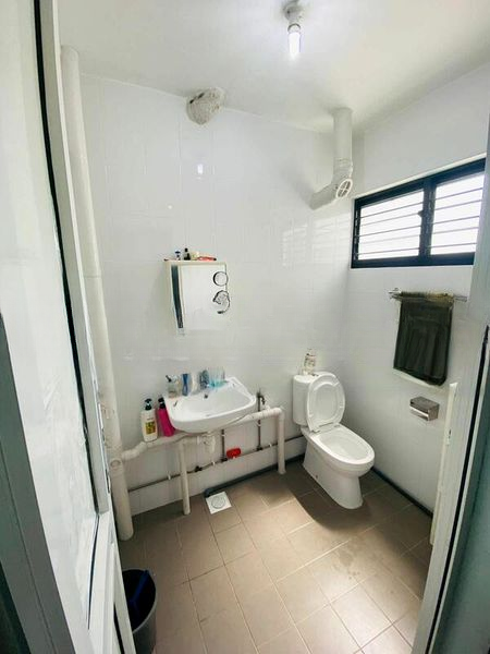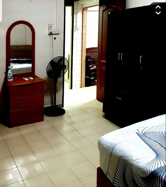 Step into a lived-in sanctuary where functionality meets comfort. The moderate natural light filters through large windows, illuminating the light blue walls and tiled flooring throughout the unit. Feel the welcoming ambiance as you explore the galley kitchen, featuring light wood-grain cabinets and black countertops, perfect for culinary adventures.