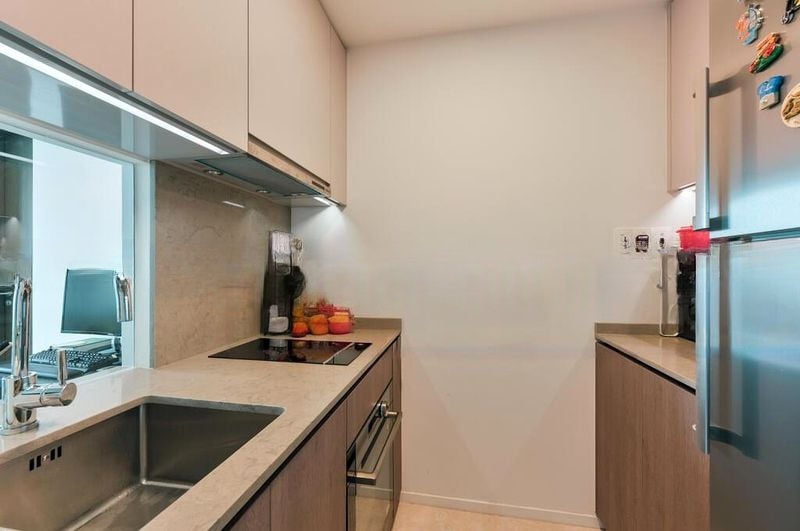 This well-maintained 2-bedroom condo features a thoughtful layout with a dedicated kids' play area in the living room, a modern galley kitchen equipped with integrated appliances, and a serene bedroom with wooden flooring and a study area. The bathroom boasts a luxurious rain shower and contemporary finishes, while the balcony invites you to unwind with unblocked views from a high floor.