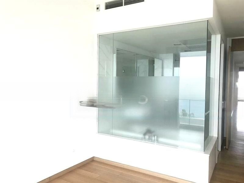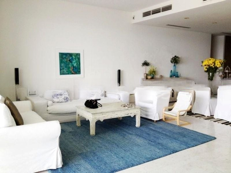 Step into a bright and airy sanctuary where abundant natural light dances across the open-plan living and dining areas. The minimalist decor, complemented by a blue area rug and white sofas, creates an inviting atmosphere. Enjoy breathtaking views of the sea and lush palm trees from your seafront balcony, complete with a glass round dining table and outdoor lounge daybed, perfect for relaxation.